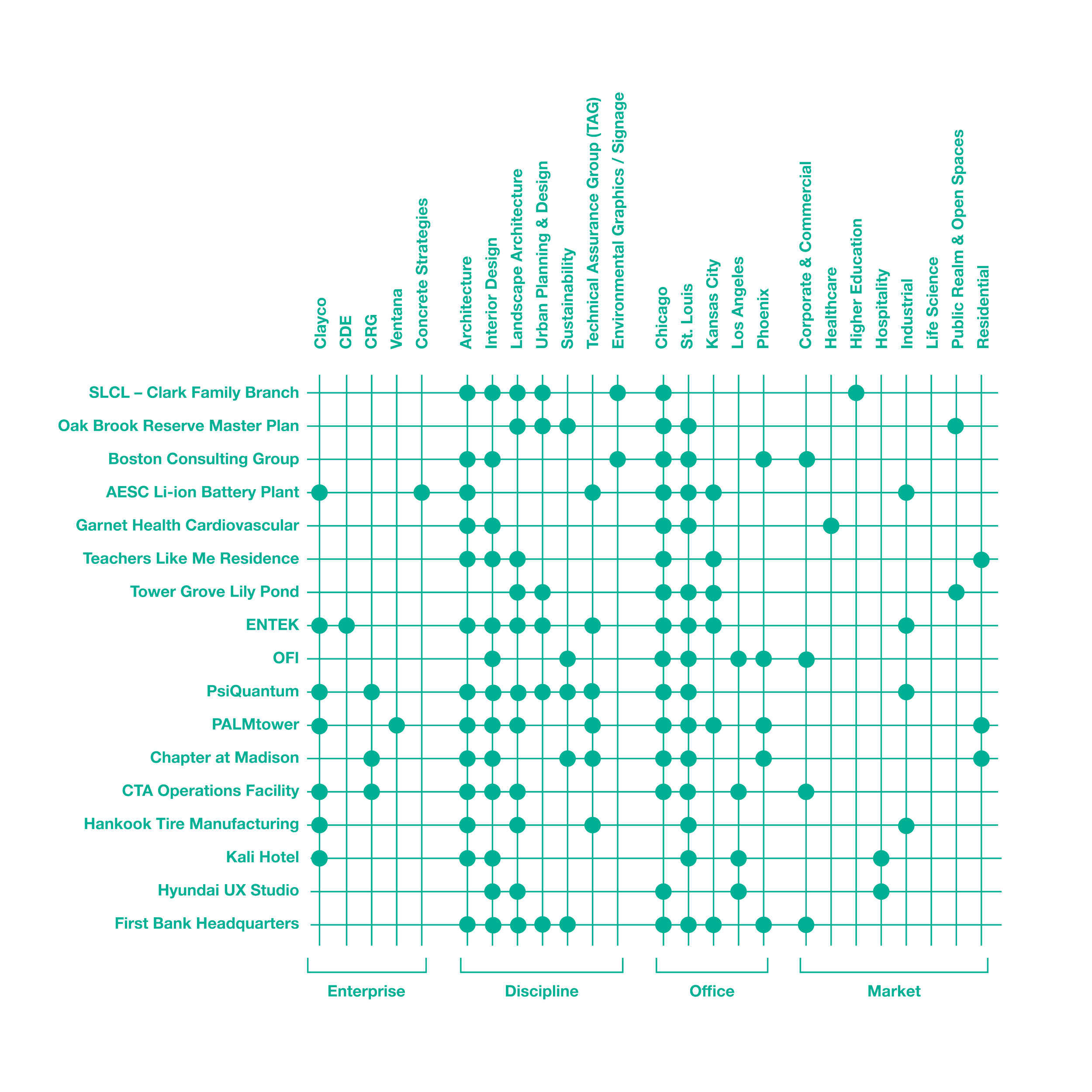 The following matrix highlights our commitment to our integrated by design practice. Each project we undertake benefits from our enterprise partners, local expertise, broad market sector knowledge, and multidisciplinary collaboration. Working together gives us a uniquely unfair advantage so we can provide our clients with an exceptional project delivery experience.