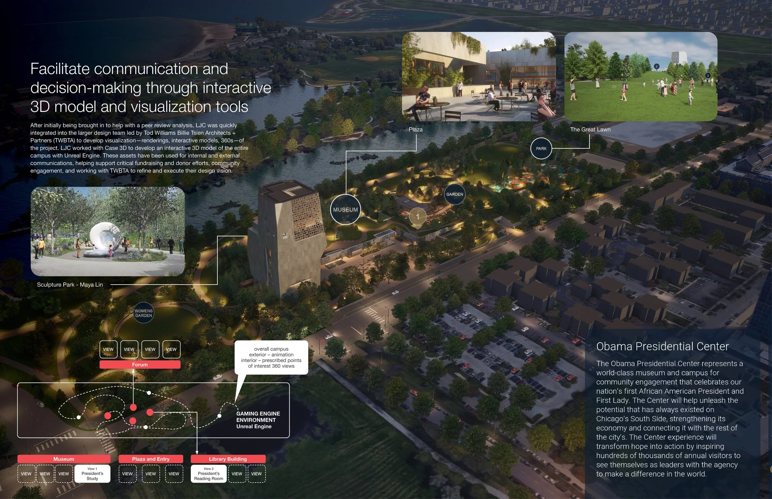 The Obama Presidential Center has been developed as an international cultural institution and campus that celebrates democracy and tells the story of the United States through the lens of our nation’s first African American President and First Lady, Barack and Michelle Obama. Located on the South Side of Chicago, the center is thoughtfully situated within the community and designed to welcome visitors from across the street and around the globe. The center showcases multiple design features across a 19.3-acre campus: A tower housing a museum, community programming spaces, and a library is surrounded by landscaped grounds that highlight a public plaza, gardens, and recreational spaces. The architecture emphasizes transparency, with glass walls inviting visitors to engage with the center’s activities and events and inspires visitors to “bring change home.”